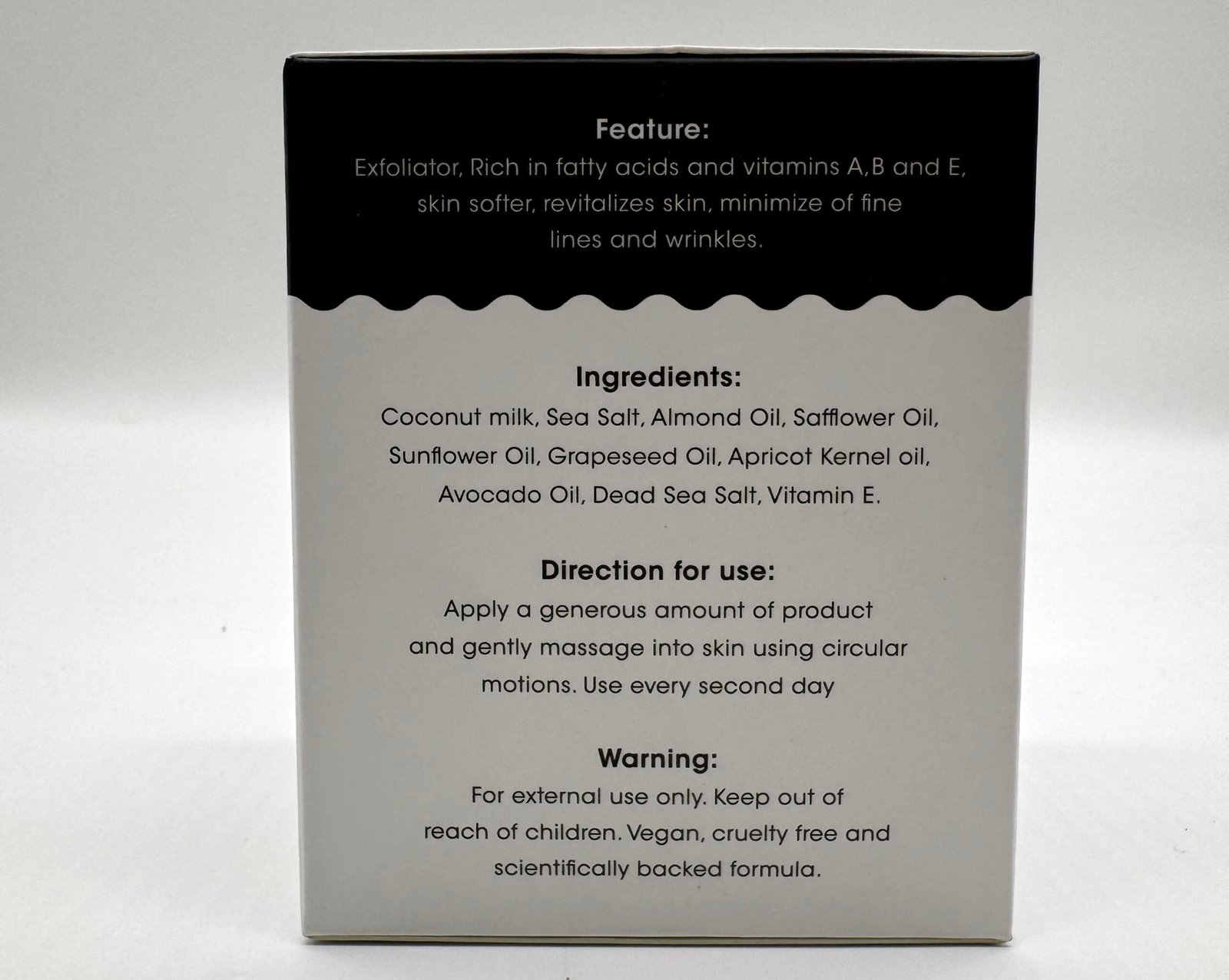 Aplicar una cantidad generosa del producto y masajear suavemente en la piel con movimientos circulares. Usar cada dos días.